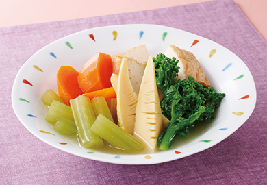 たけのこ(ゆでたものまたは水煮)、にんじん、ふき(板ずりしてゆで、皮をむく)