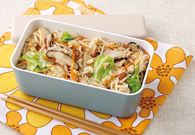 • 1.フライパンにAを入れて火にかけ、肉の色が変わったらBを加えて火を通し、ビーフンを加えて炒め合わせる。