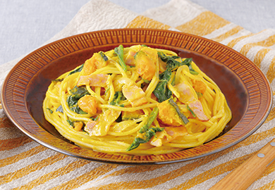 • 2.①のかぼちゃを軽くつぶし、スパゲティを加えて全体を混ぜる。