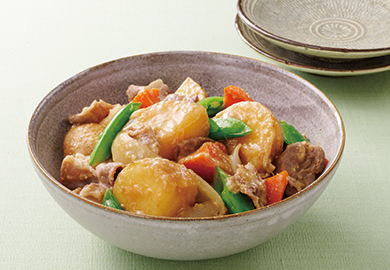 • 2.①の豚肉に火が通ったらBを加えて約10分煮、じゃがいもがやわらかくなったらみそを溶き入れて約5分煮、スナップえんどうと共に器に盛る。
