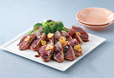さっと焼いたかつおと甘酸っぱいソースは相性◎。