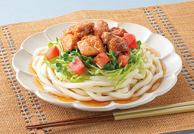 照りよく焼いた鶏肉がのったボリュームうどん。