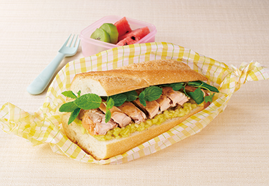 • 3.フランスパンに切り込みを入れて②、①、ミントの順に半量ずつはさむ。合計2個作る。