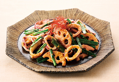 • 1.フライパンにごま油を熱してれんこんを炒め、火が通ったらいかを加えて炒める。