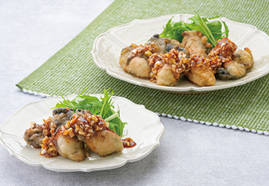 • 2.中温に熱したサラダ油で①を火が通るまで揚げて器に盛り、混ぜ合わせたBをかけて水菜を添える。
