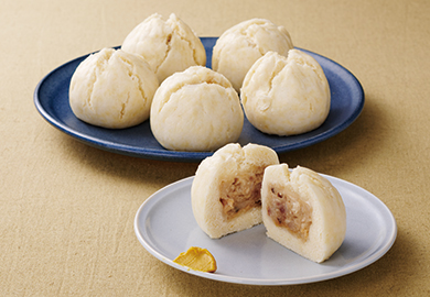 • 1.ボウルにAを入れて混ぜ、約10分おいて6等分にし、丸く広げてシュウマイをのせて包み、5cm角に切ったオーブン用シートにのせる。合計6個作る。