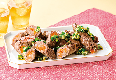 • 1.牛肉1枚にAの1/8量をのせて巻く。合計8本作る。