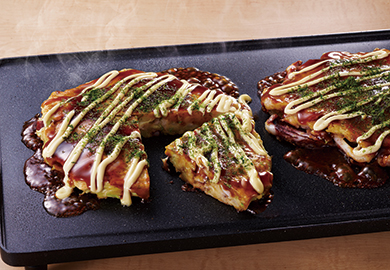 • 2.油をひいて温めたホットプレートに①を等分に流し入れ、約3分焼いてひっくり返し、ふたをして約4分蒸し焼きにし、ふたを取って約2分焼く。