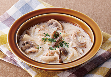 • 1.鍋にバターを溶かしてAを炒め、小麦粉を入れてなじませ、Bを加えて混ぜながら中火で5〜6分煮る。