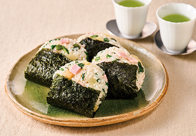 • 2.ボウルにA、①を入れてさっくりと混ぜ、4等分にして平たい丸形のおにぎりを4個作り、のりを巻く。