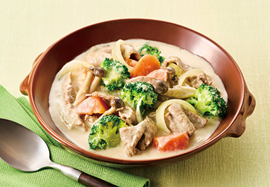 • 2.①に混ぜ合わせたBを少しずつ加えて混ぜ、とろみがつくまで煮たらブロッコリーを加え、弱火で約5分煮て火を通す。