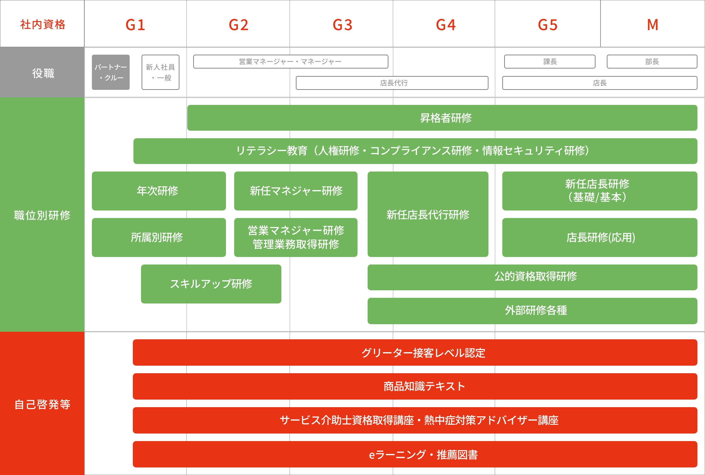 マルエツでは職位別に研修のプログラムが用意されており、新入社員から一般まではマネジャーの代行業務ができるよう、実務に直結したテクニカルスキルを学びます。上級の職位にステップアップした後は、新任のマネジャー・店長代行・店長・課長など、それぞれの実務を遂行するための研修が用意されています。自己啓発のために「eラーニング講座」を全社員に向けて提供しています。eラーニング講座では、マーケティング、リーダーシップなどの知識を身につけることができます