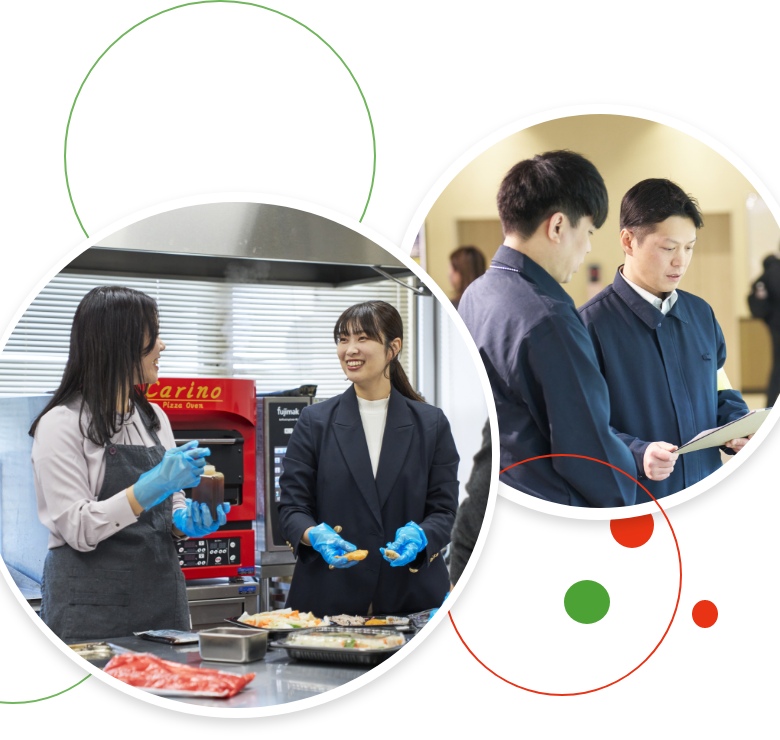 入社後、(株)日本流通未来教育センターにて、新入社員全体研修としてオリエンテーシヨンを行い、ビジネスマナーやスーパーマーケットの基礎知識を学びます。その後、各所属別に実技や座学の研修を行います。店舗の配属後も、所属別研修やレジ研修を実施。各店舗でのOJT(オン・ザ・ジョブ・トレーニング)を中心に、集合研修(商品知識・加工技術・販売計画)や全体研修(管理会計・人事労務管理等の専門知識)など、さまざまなカリキュラムが用意されています