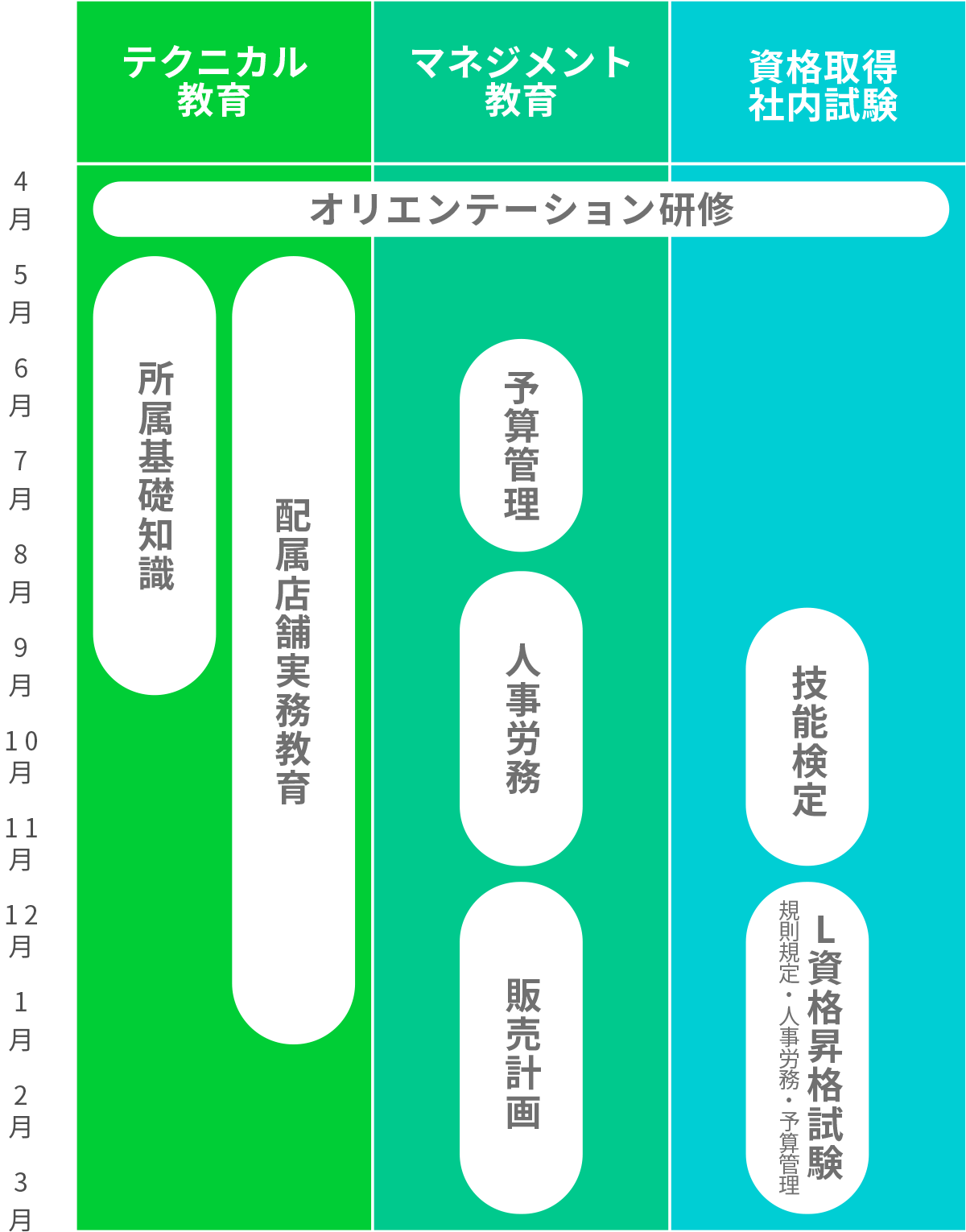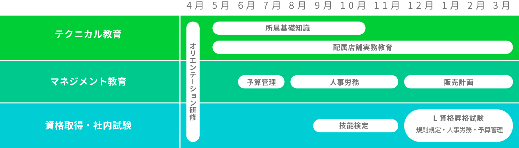 各店舗でのOJT(オン・ザ・ジョブ・トレーニング)を中心に、集合研修(商品知識・加工技術・販売計画)や全体研修(予算管理・利益管理・人事労務等の専門知識)など、さまざまなカリキュラムが用意されています。