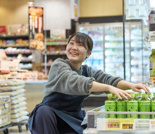 日配・加工食品の品出しを中心に、平台の作成や売場づくりを行っています。牛乳やパンなど日配商品の発注業務のほか、荷受けや仕分け、値引き作業にも対応します。また、数値確認や発注管理などのPC作業を通じて、売場全体の状況を把握しながら業務を進めています。