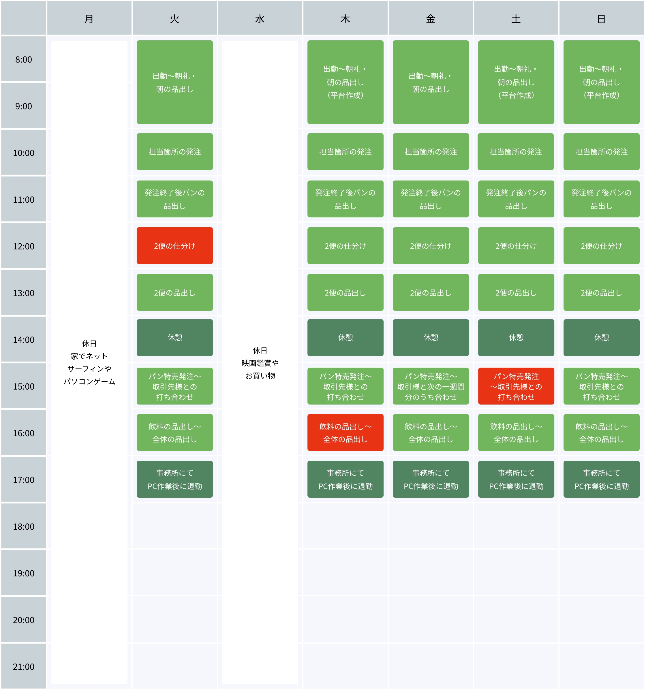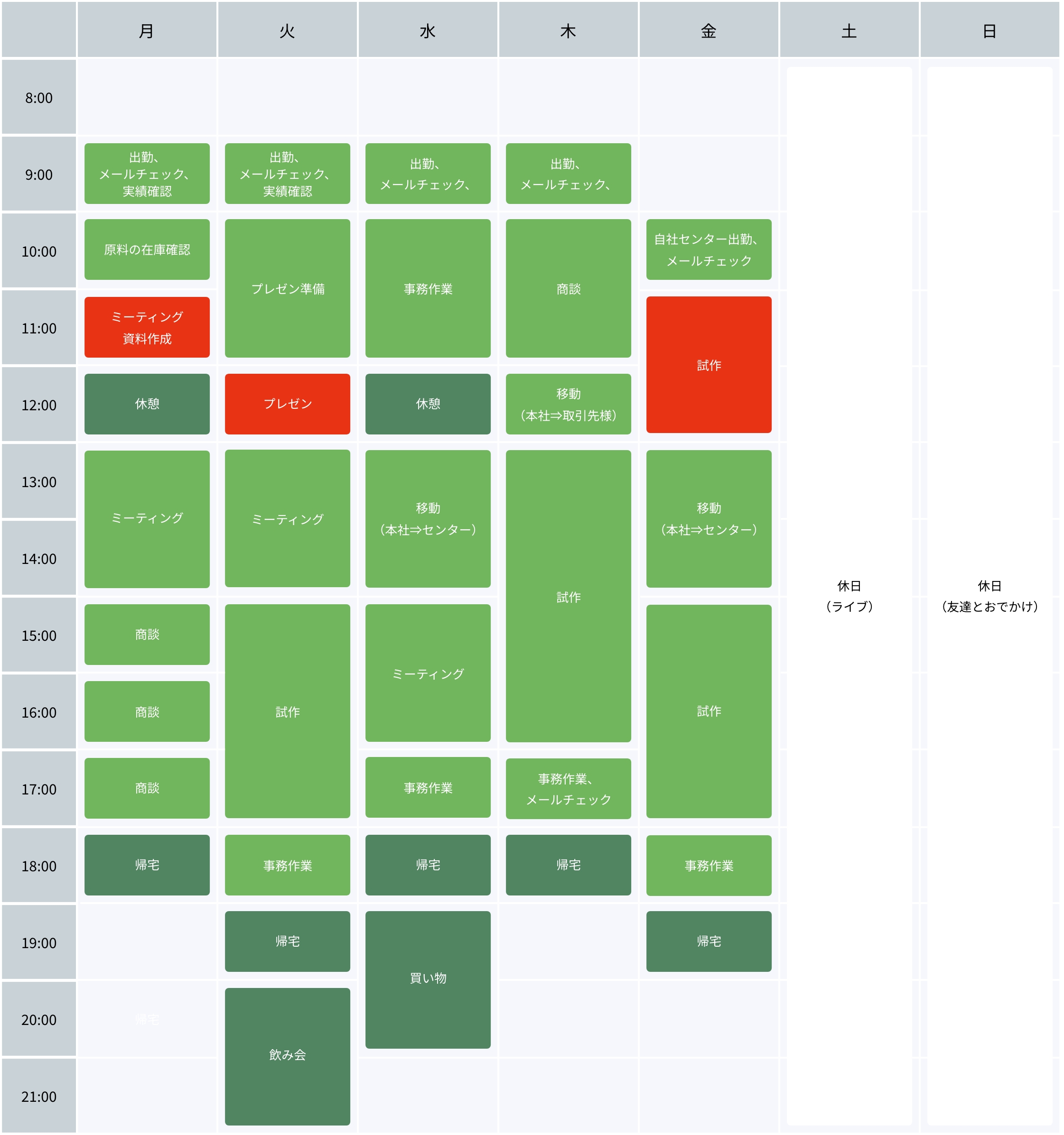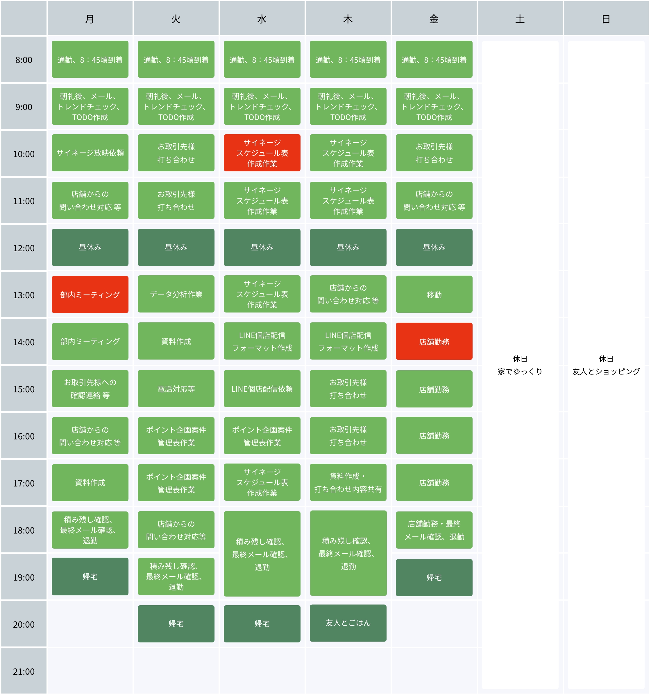 入社したらどんな仕事をするんだろう?皆さんが1番気になるところだと思います。各担当ごとにどんな1週間を過ごしているのか、タイムスケジュールをご紹介します。